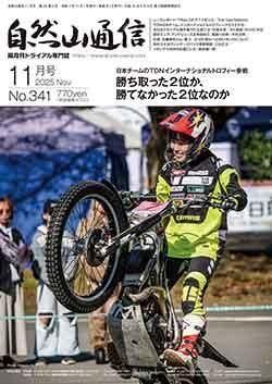 【隔月刊・自然山通信11月号の内容/B5サイズ・オールカラー・90ページ】 2025全日本トライアルR5広島・三次灰塚大会・IAS 野崎史高、ぶっちぎり勝利。負傷療養からの復活!・IA 山本直樹、ラップオールクリーンで勝利・LTR 中川瑠菜、初のタイトル獲得に王手・IB ローティーンが上位を占める/2025全日本トライアルR6宮城・SUGO大会・IAS 好調、黒山健一シーズン3勝目・IA 平田貴裕、2勝目でタイトルに1ポイント。高橋寛冴も2位でこれに食らいつく・LTR 中川瑠菜が全勝優勝で初タイトル獲得。小玉絵里加2位でランキング争い熾烈に・IB 寺澤欠場、木村勝利。岡が3位表彰台/2025 FIMトライアル世界選手権R7イギリス(最終戦)・TrialGP Day1/Day2 ボウの38回目の栄冠はイギリスの土曜日に降臨なり・Trial2 Day1/Day2 新世代の到来か。ハリー・ヘミングウェイ快挙・Trial3 Day1/Day2 黒山陣、T3クラス出最後に総合優勝獲得。そして世界ランキングは4位となる。2026シーズンはT2クラスへ打って出る・ TrialGP Women/Trial2 Women Day1/Day2 ベルタ・アベラン、WGPの初タイトルを獲得する/2025 FIMトライアル・デ・ナシオン・男女ともスペイン勝利。TDNチャンピオンシップ・インターナショナルトロフィー激戦。日本連勝ならず、アメリカが4点差で勝利・インターナショナルトロフィーで2位となった日本。勝ち取った2位か、勝てなかった2位なのか/イタリアでの休日の過ごし方・西賀順一郎/師匠ミック・アンドリュース氏を訪ねて。木村治男さんと木村家三世代、英国への旅/2025新ルールのいろいろについて/巨星、近藤博志さん、墜つ/ミタニオヤジの高齢者の青春・秋の3大会ヴィンテージバイク参戦物語/2026年FIM世界選手権日程が出た/東本昌平さんとトライアル/沖縄トライアル大会第8戦/2025メイクカップトライアル